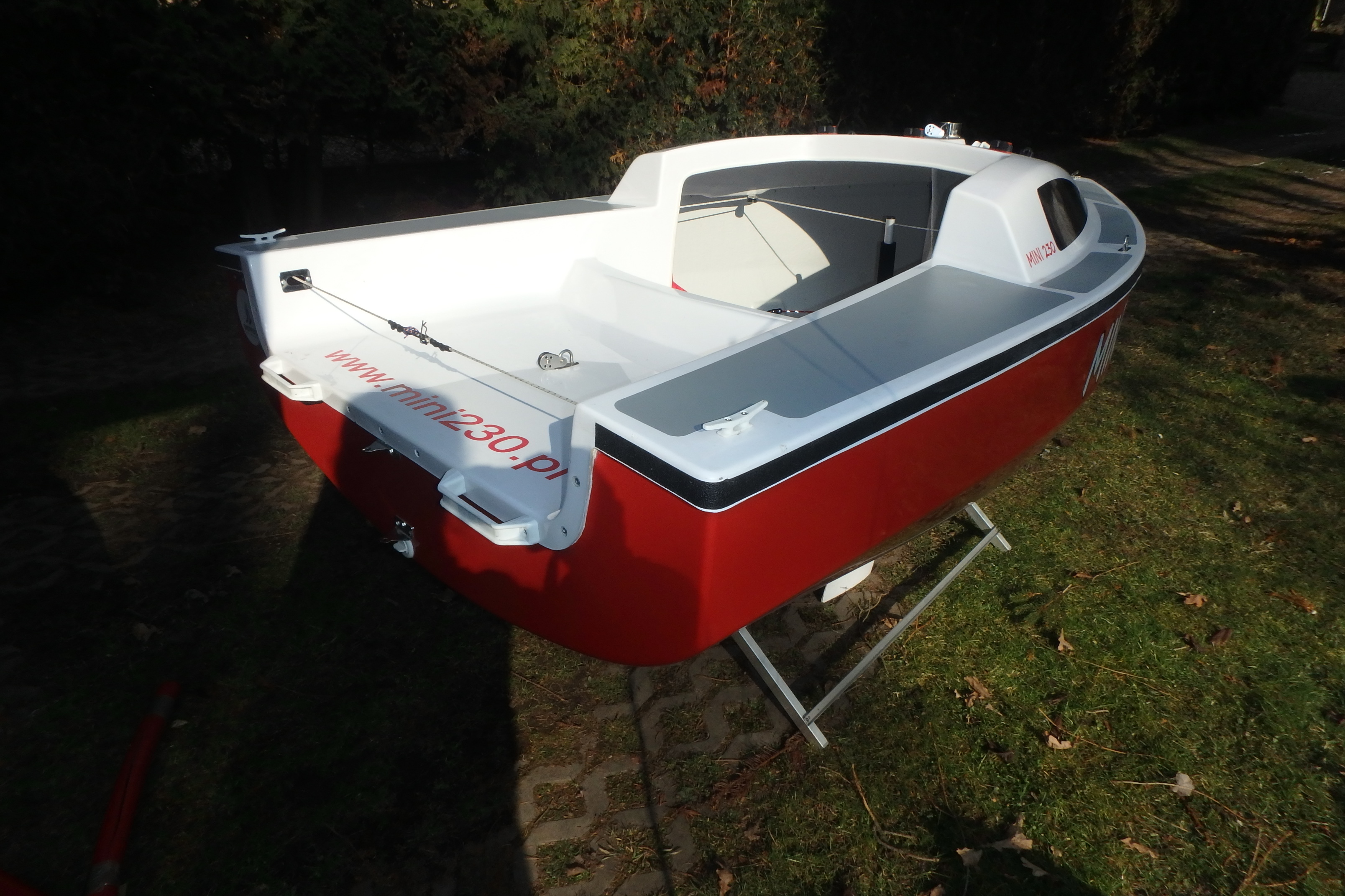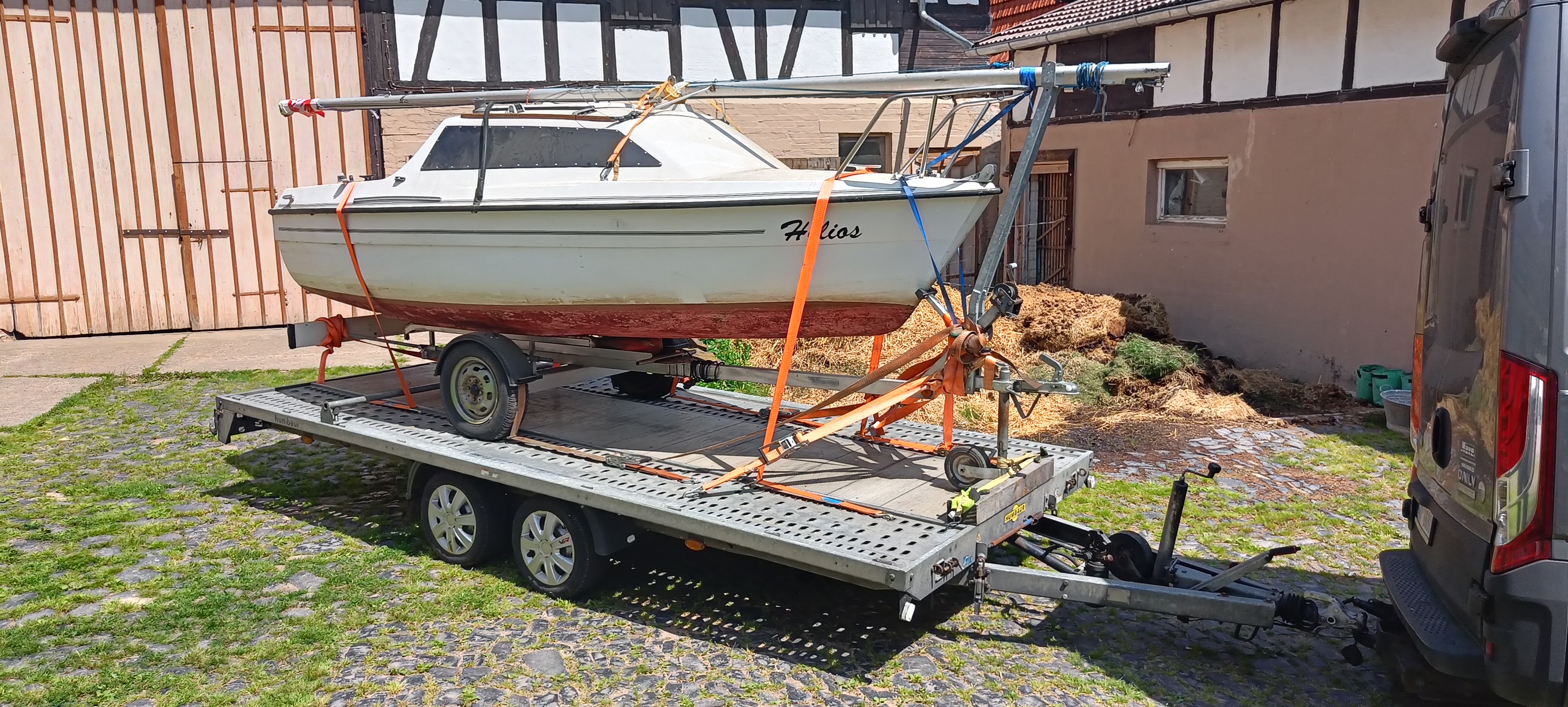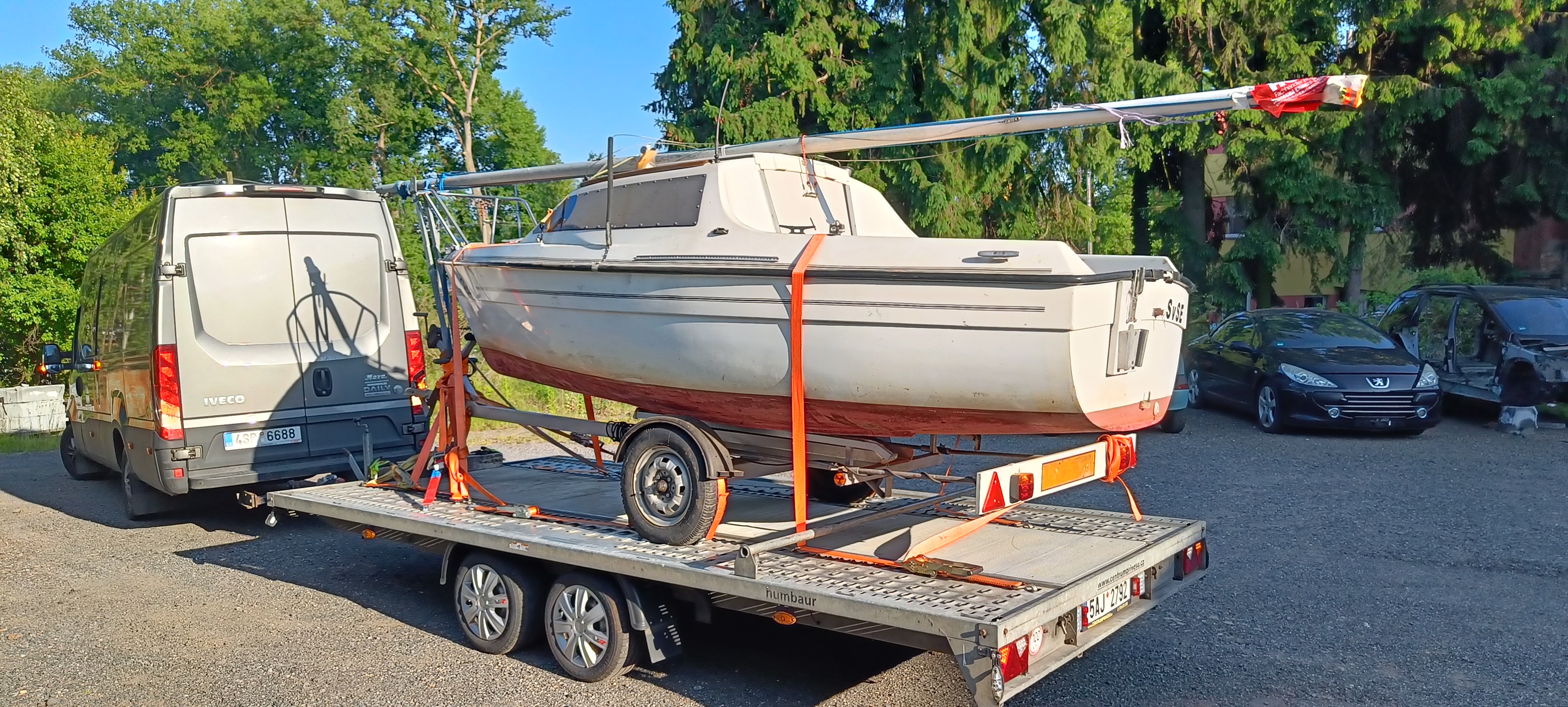 Je to malá kajutová plachetnice (délka 4,7m šířka 1,7m, stěžeň 6m) s výsuvným kýlem (ponor 0.35-1,15m). Výrobce zatím neznámý, ale snad se k němu dopracuji. Řekl bych že to bude nějaká anglická výroba, protože na trupu je vidět příprava i pro 2 kýly a vlek k ní má také anglické štítky. Rok stavby cca 70.léta. V kajutě výška akorát na sezení, 2 lůžka, úložné prostory. Hlavní celospírová plachta + kosatka na rolfoku, 24lbs elektromotor. Jediné co chybí je kormidlo, to budu muset rychle vyrobit, příští týden bych ji chtěl odvézt na vodu.