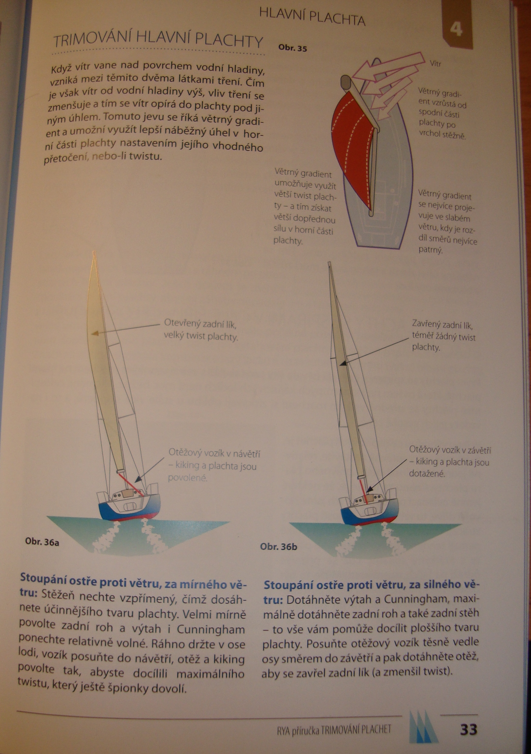 - Nebo mám ráhno vyložené úplně stejně, ale vozík přesunu do návětří. Musím samozřejmě prodloužit otěže. Ty již netáhnou ráhno přímo dolů, ale mírně zešikma a tím pádem nemám zadní lík tak vyšponovaný a dochází ke zvětšení twistu.