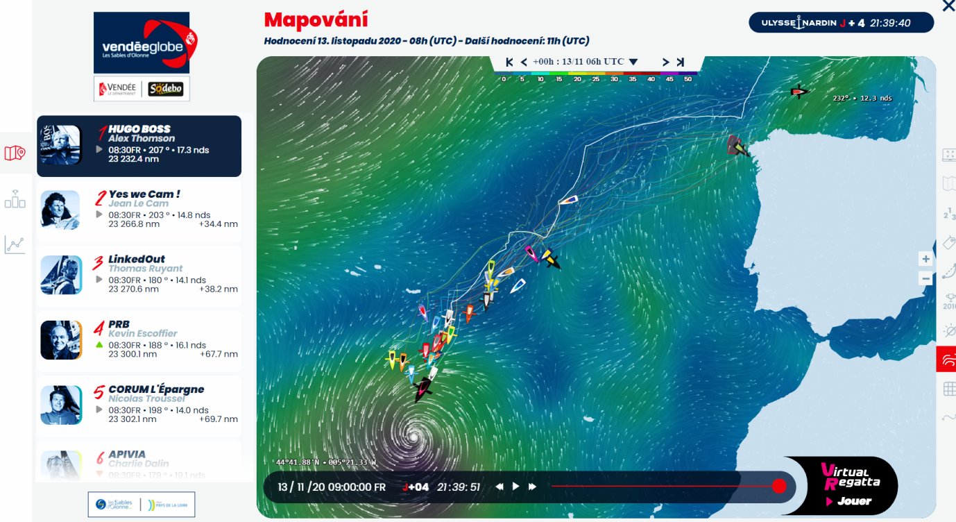 Musím říct, že nejstarší účastník Le Cam mě neustále překvapuje. Sleduji ho pravidelně téměř každý den. 17 den závodu a on stále drží velice pěkné 3 místo na starší lodi bez foilů. Klobouk dolů. Holt zkušenosti. Už kterýsi jiný účastník v pravidelných relacích s pořadateli zmínil že bude muset požádat Jeana o radu...jak to dělá.