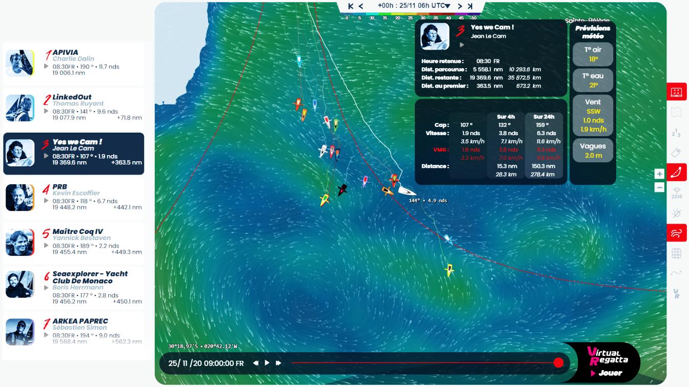 Zatímco se Fabrice Amédéo musel otočit, aby opravil svůj problém s vytehem gennakru (nemohl ho spustit) flotila pokračovala na západ a hledala zmenu větru, ktera způsobí, že dnes ráno ozoci správným směrem: na jih! Mezi foily a driftovými čluny se již prohlubují mezery: 120 mil dnes ráno v 5 hodin mezi Nicolasem Trousselem (CORUM L'Épargne) a Clément Giraud (Compagnie du Lit / Jiliti).