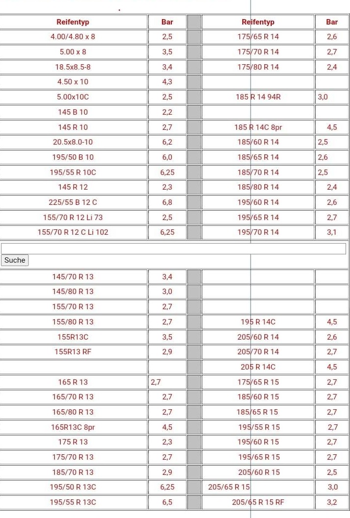 Hodnoty v tabulce budou stejné jako na pneumatice, je ze stránek německého výrobce přívěsů, jen se nemusíš sklánět k zemi a hledat mrňavá černá číslíčka...