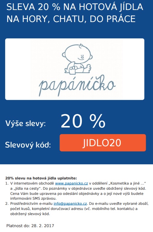 nechce-li se vám vařit a ani nepřesvěčíte tchyni k zavařování, tak v příloze je kupon na 20% slevu na hotová jídla s vysokou trvanlivostí