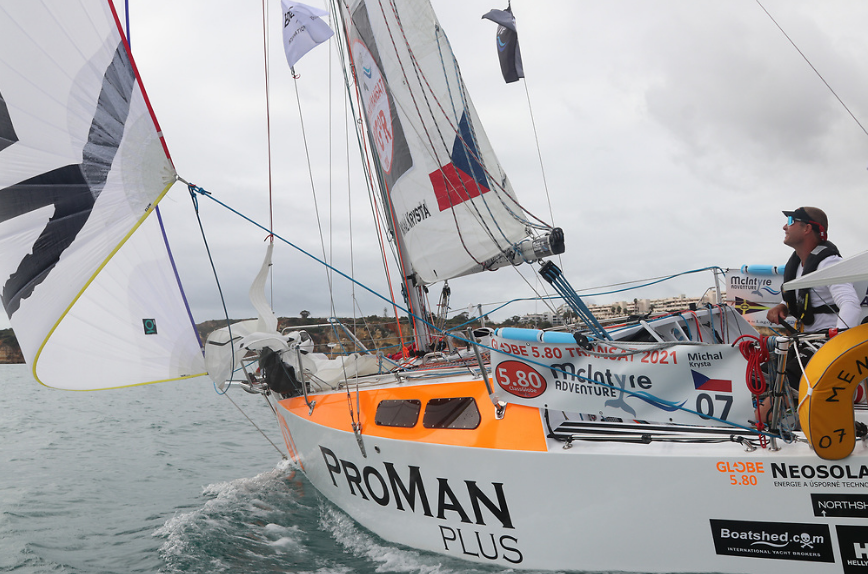Michal Krysta ukazuje svoji loď před startem sólo závodu přes Atlantik Class Globe 5.80 video ZDE