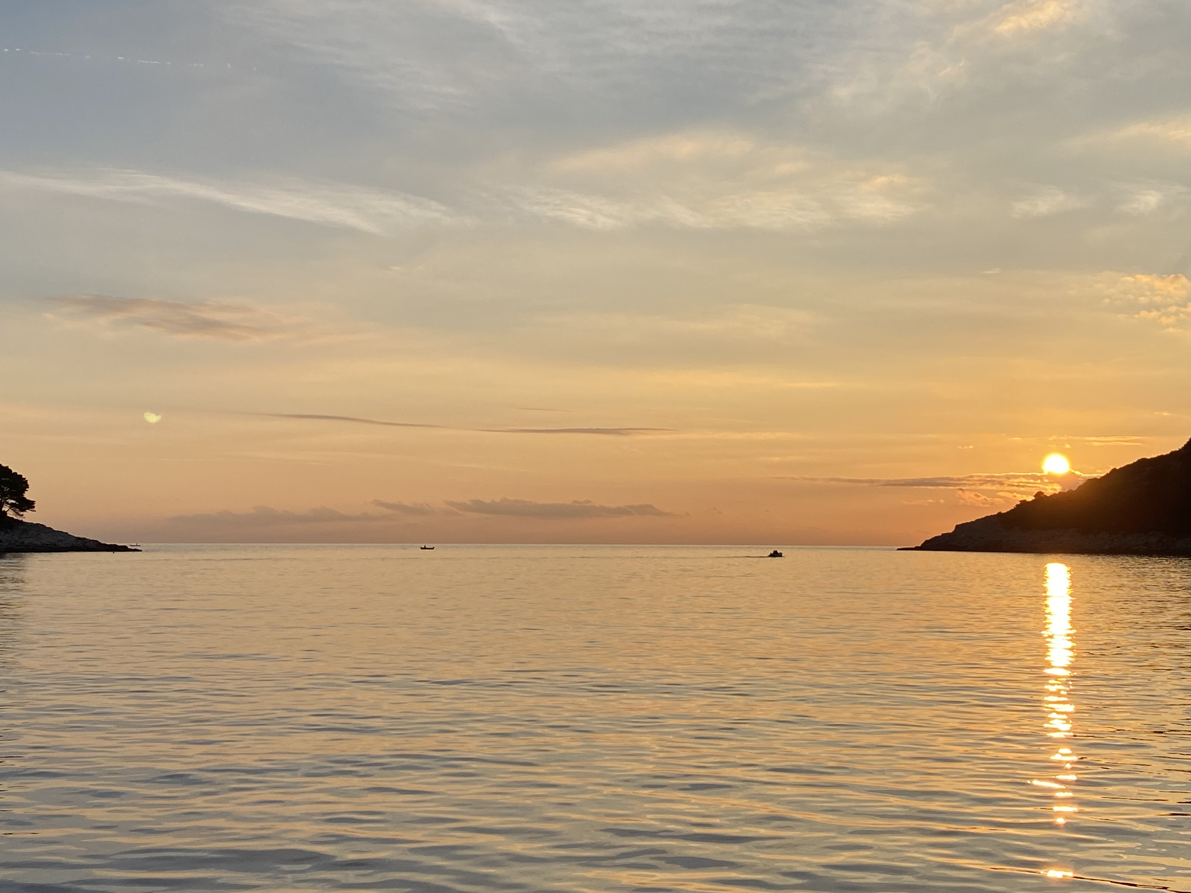Zátoka Saplunara, jihovýchod ostrova Mljet, jedna z mála písečných pláží v Chorvatsku. V noci houpání na swellu, co jde pořád z otevřeného moře, až nad ránem se loď uklidní, když se postaví proti ranní bríze.