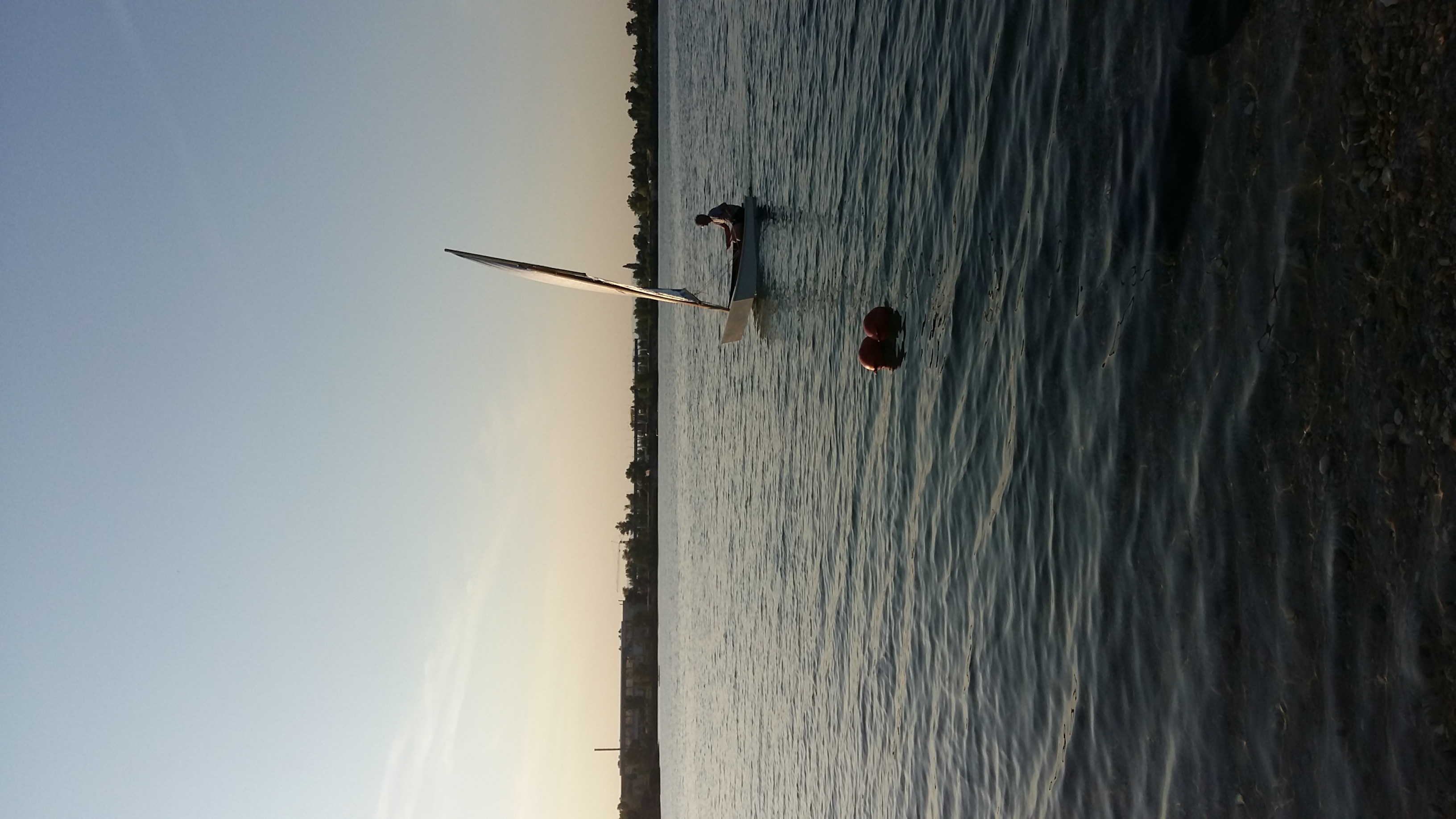 Asi třetinu cesty zpátky už byla voda jak zrcadlo (za náma ještě foukalo, ale tam to bylo houby platné), tak jsem si řádně vyzkoušel vesla. Resp. nemám vesla, používám místo nich dvě pádla z paddleboardu (nechci pořizovat další krámy). Havlinky mám cca metr od přídě, a klasicky pozadu mi veslovat moc nešlo - asi proto, že jsem měl moc vysoký posed (ve výšce havlinek, pádla pak šla moc strmě dolů a nedařilo se mi je dostávat ve správný moment nad hladinu, což dost brzdilo) - a asi taky moc nepomohlo, že pádla od paddleboardu jsou zahnutá. Nakonec jsem vesloval obráceně - čelem dopředu - a to šlo docela dobře (rychlost nic moc, ale na vyplutí od břehu a nouzový dojezd úplně v pohodě).