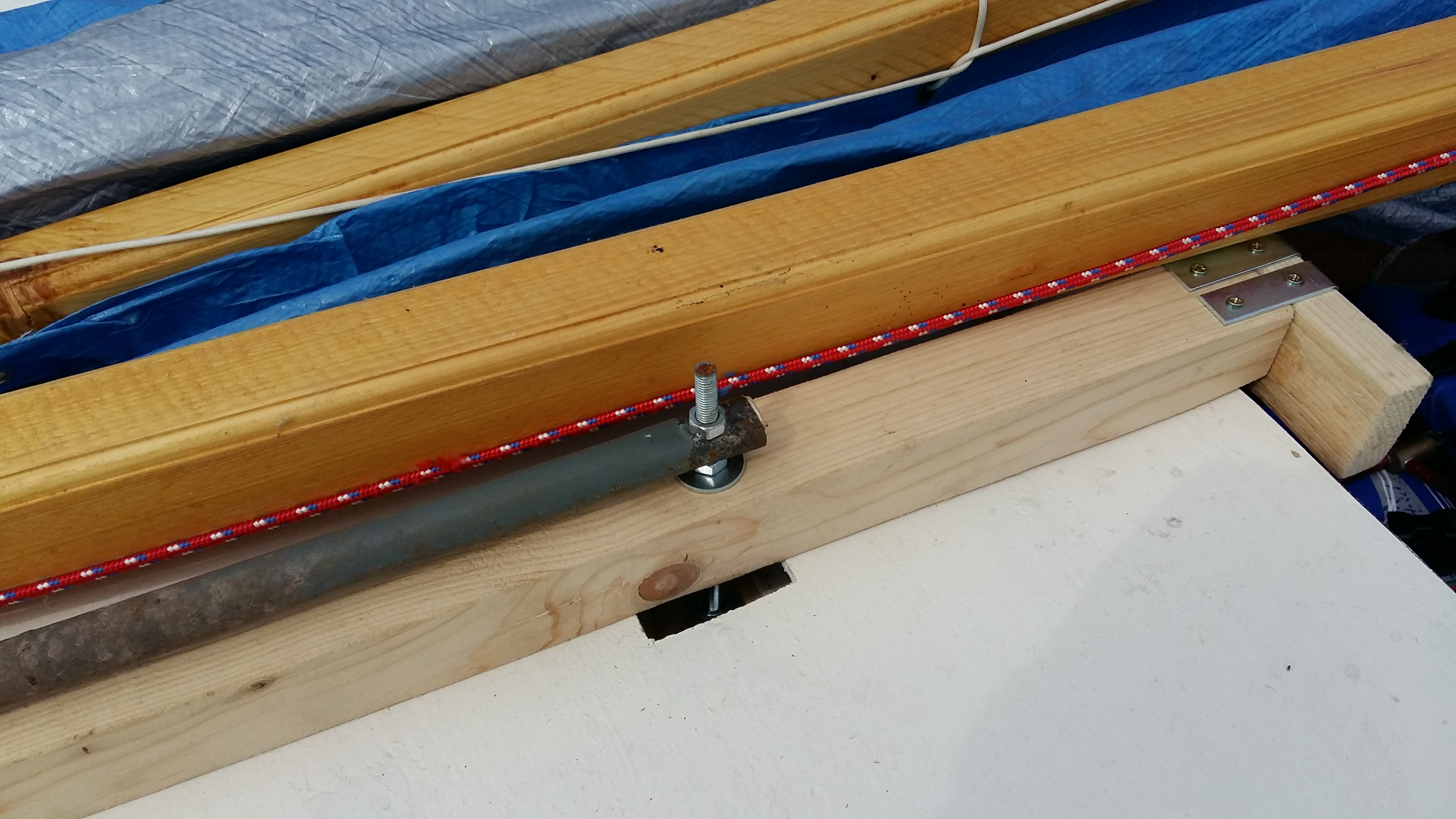 Jinak stěžeň mám chycenej taky k přepážce, ale třmenama a po nasazení musím vždy otevřít dekl a třmeny přitáhnout třináctkou klíčem. Plachta je nejjednoduší koupit i se stěžněm za pár korun z nějakýho starýho windserfingu. Já používám z Artis Triton a kachna poslouchá pomalu jak Optík.