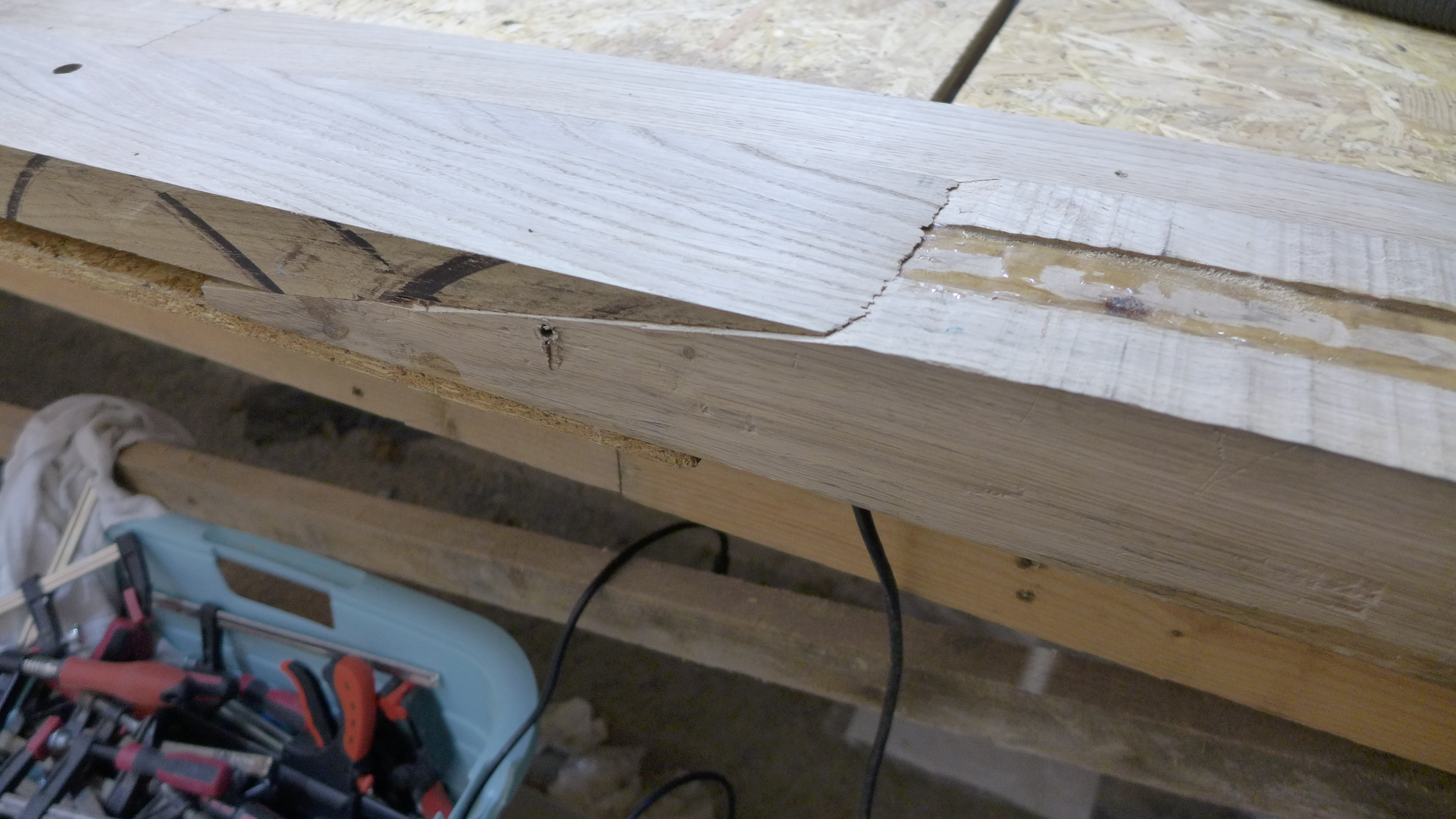 Nebylo to zlomení, spíš natrhnutí. Nepříjemné, ale zase se tím to napětí uvolnilo a nehrozí problém v budoucnu, trhliny jsem zalil epoxidem a podlepil, prošrouboval. Ten problém byl jen u boků, u dna se deska prohýbá s kýlem i s bortem a rozdíl není takový. Trocha tmelu u přídě a bylo.