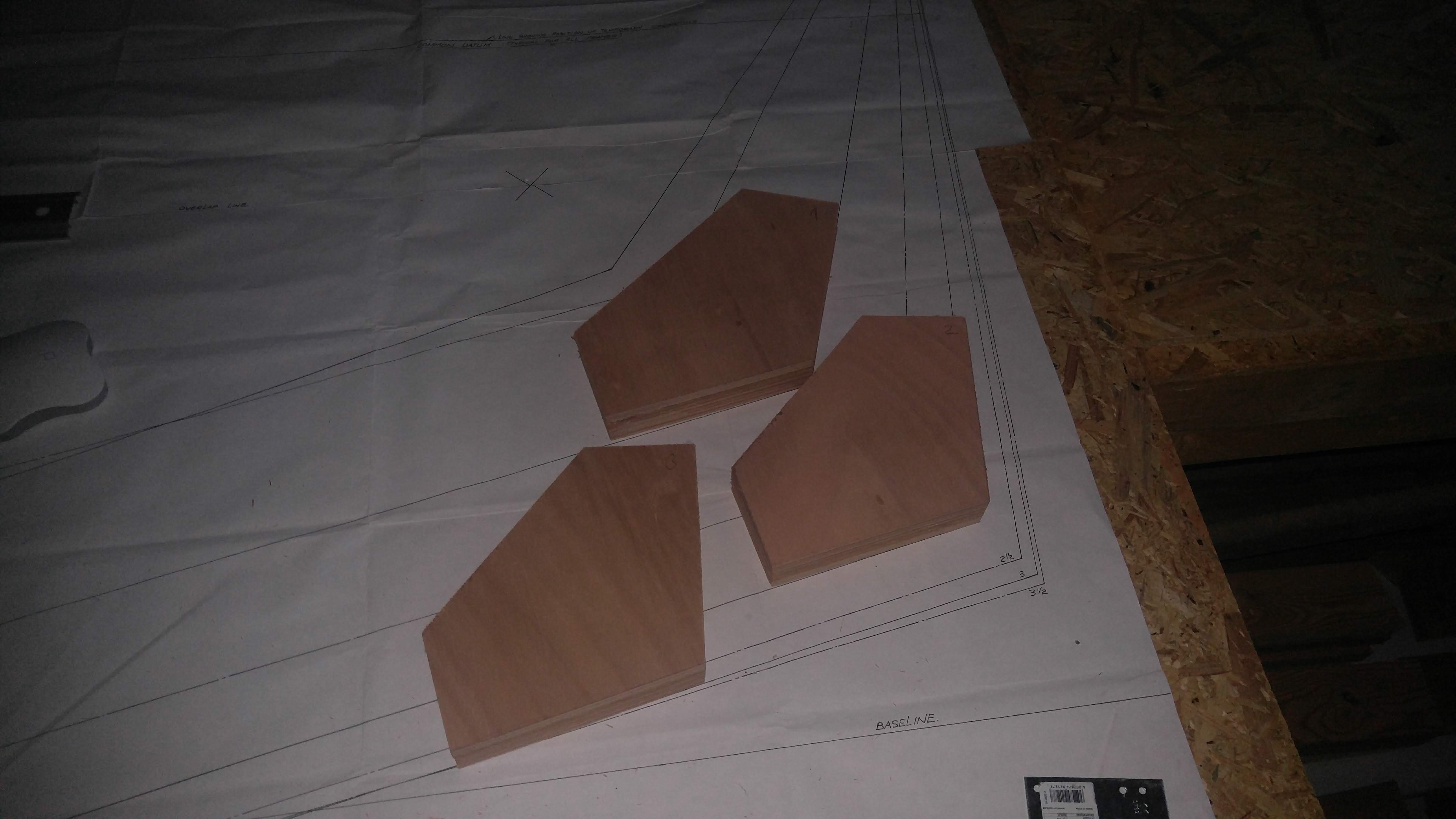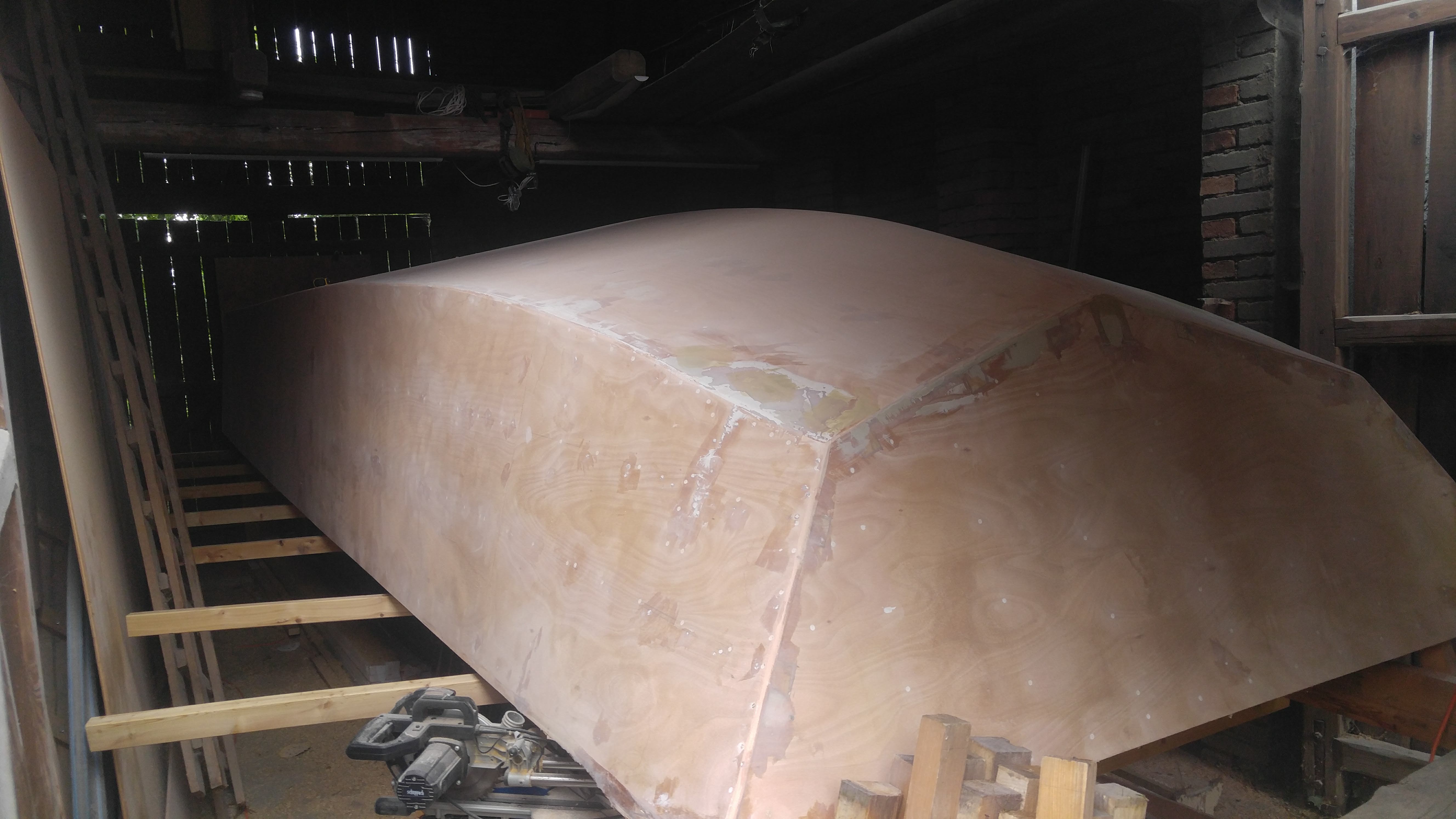Desky lze ohýbat pouze v jednom směru. Proto trupy z celých překližkových desek jsou lomené šarpie a ne lodě dokulata. Ale tady byl tento princip v plánech porušen, resp. částečně - jak se boky blíží k přídi, bortový okraj jede stále rovně, zato vnitřní okraj se sklápí ke středu lodi, takž vlastně do zkrutu. Ten zkrut vytváří u přídě takový lavor a šikmou tenzi. Okoume překližka je poměrně měkká, ale zároveň ne zas tak pevná v tahu. Takže ano, dostal jsem to do správného tvaru přitáhnutím pomocí několika kurt, ale překližka mi u okrajů praskla, jak se tam přeneslo napětí.