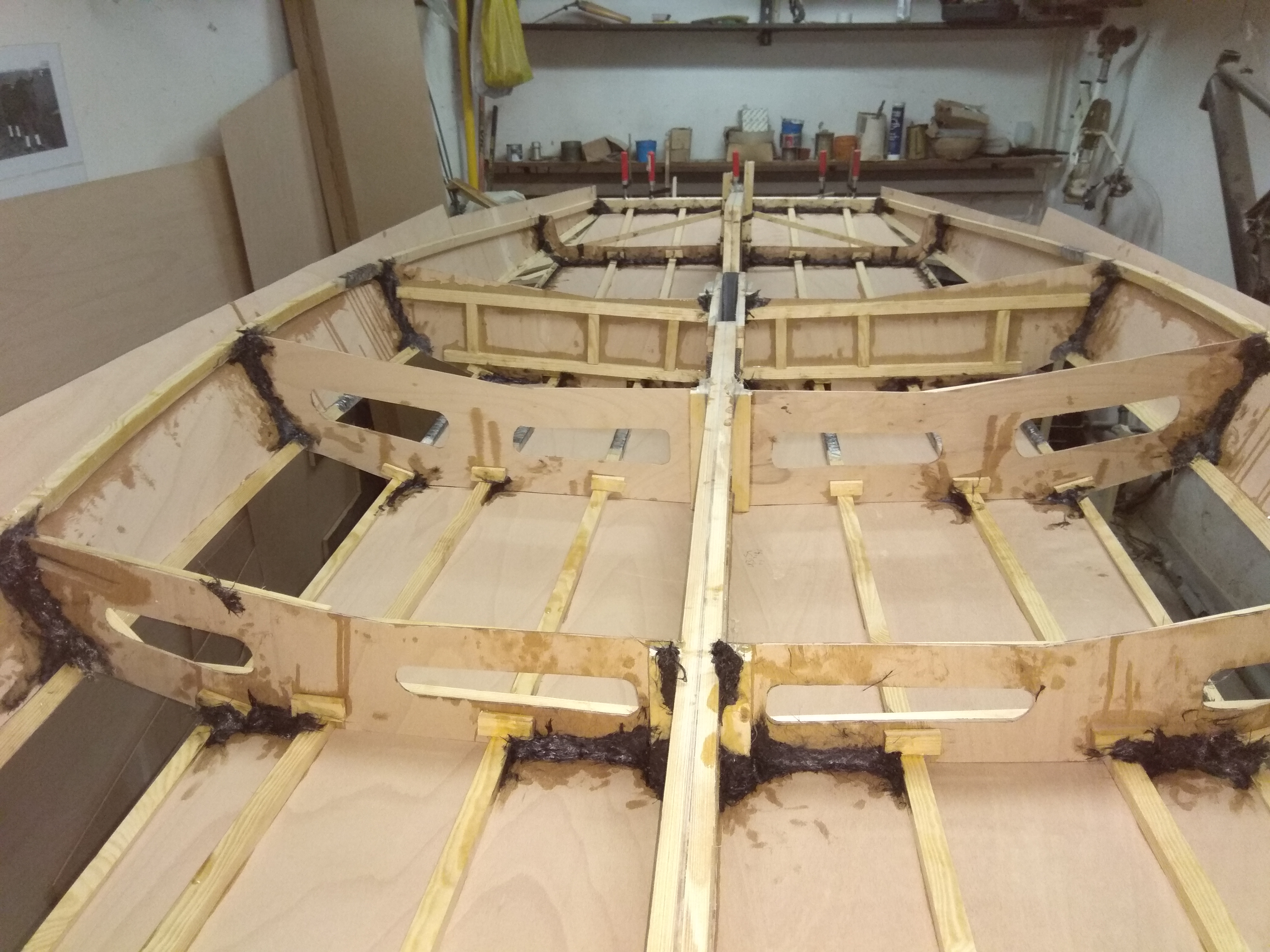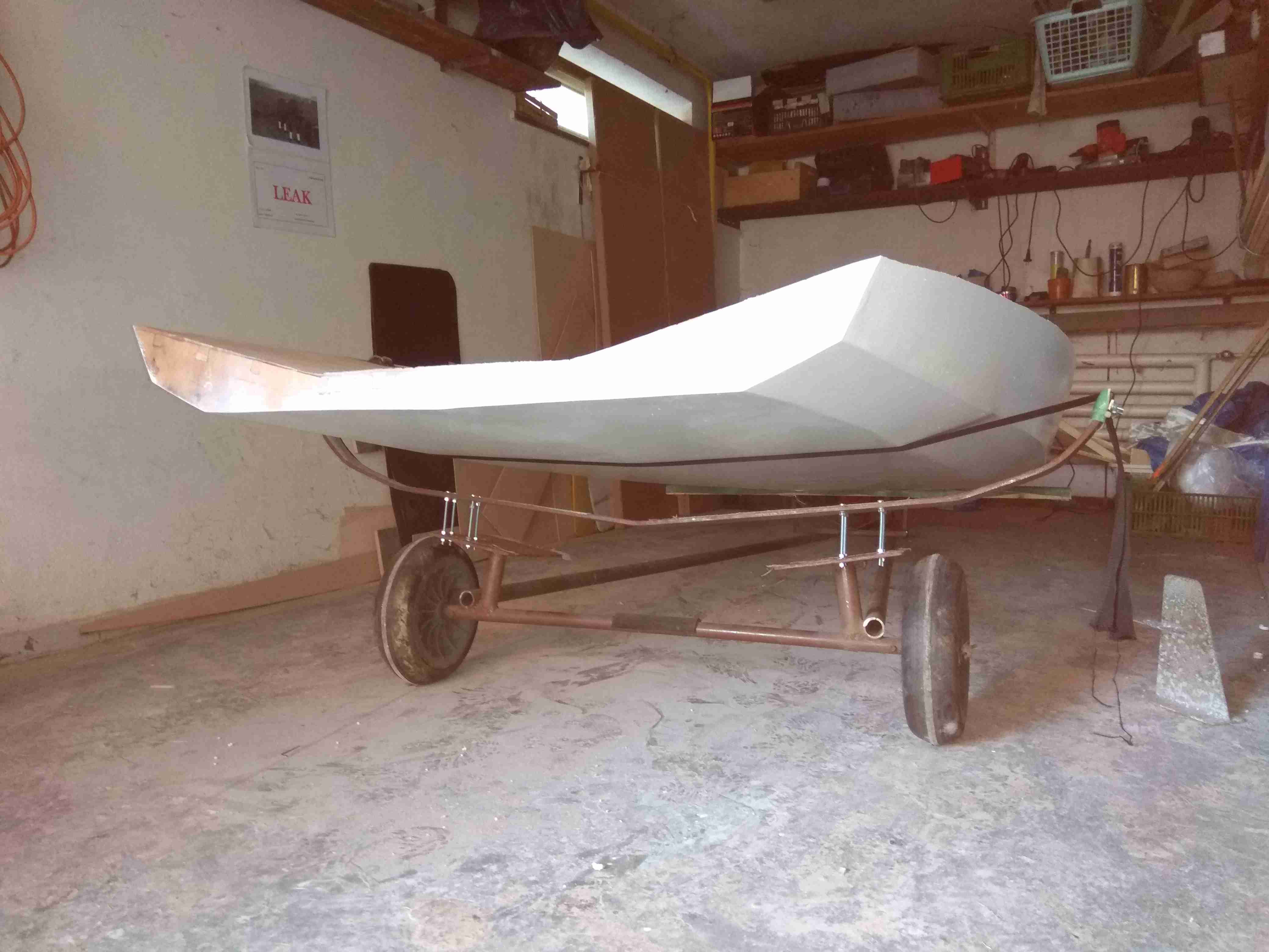 Už se to blíží. Spodek trupu hotový, manipulační vozík ze 470 předělaný, ještě dodělat vršek, trubky na sezení a takeláž. Chtěl jsem použít co půjde z Evropy, ale přes zimu mi ji ukradli.