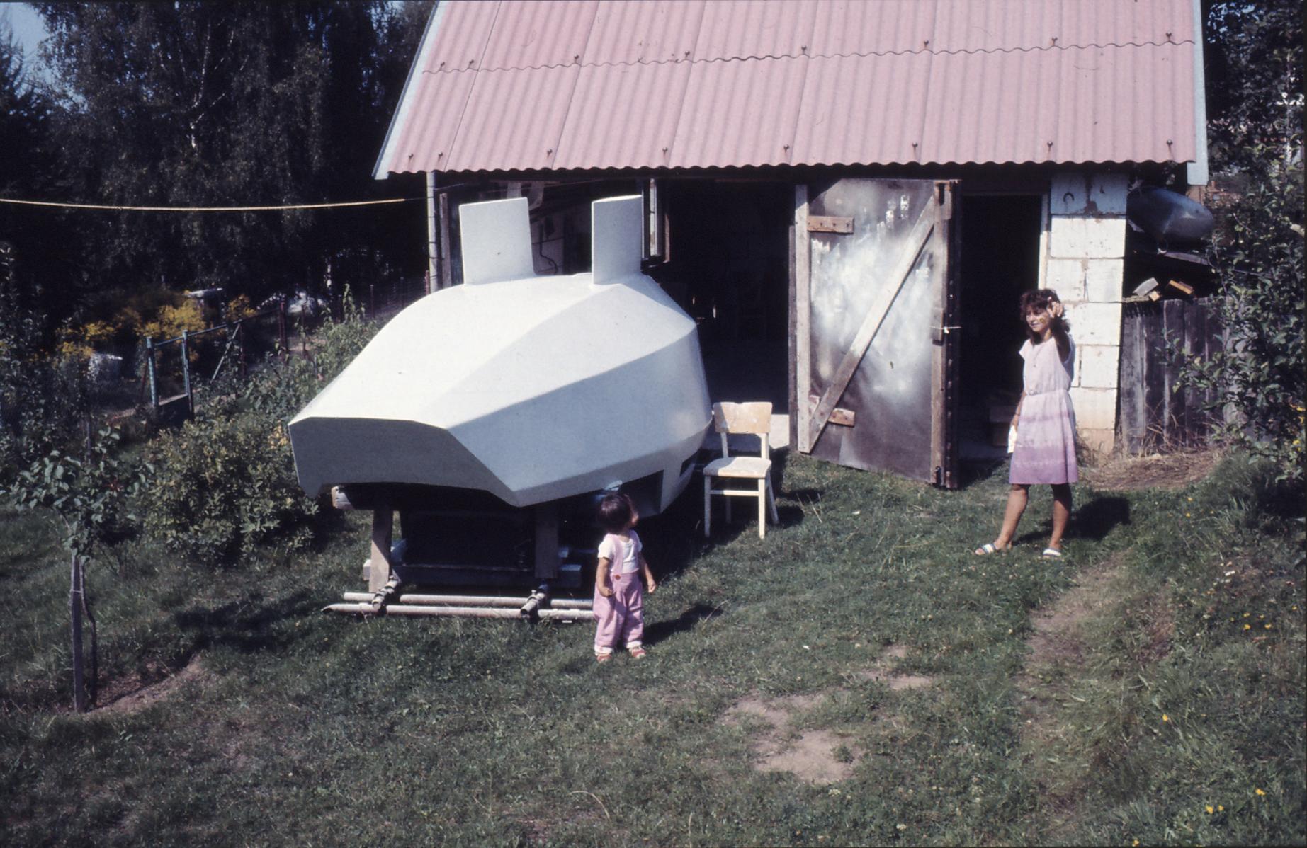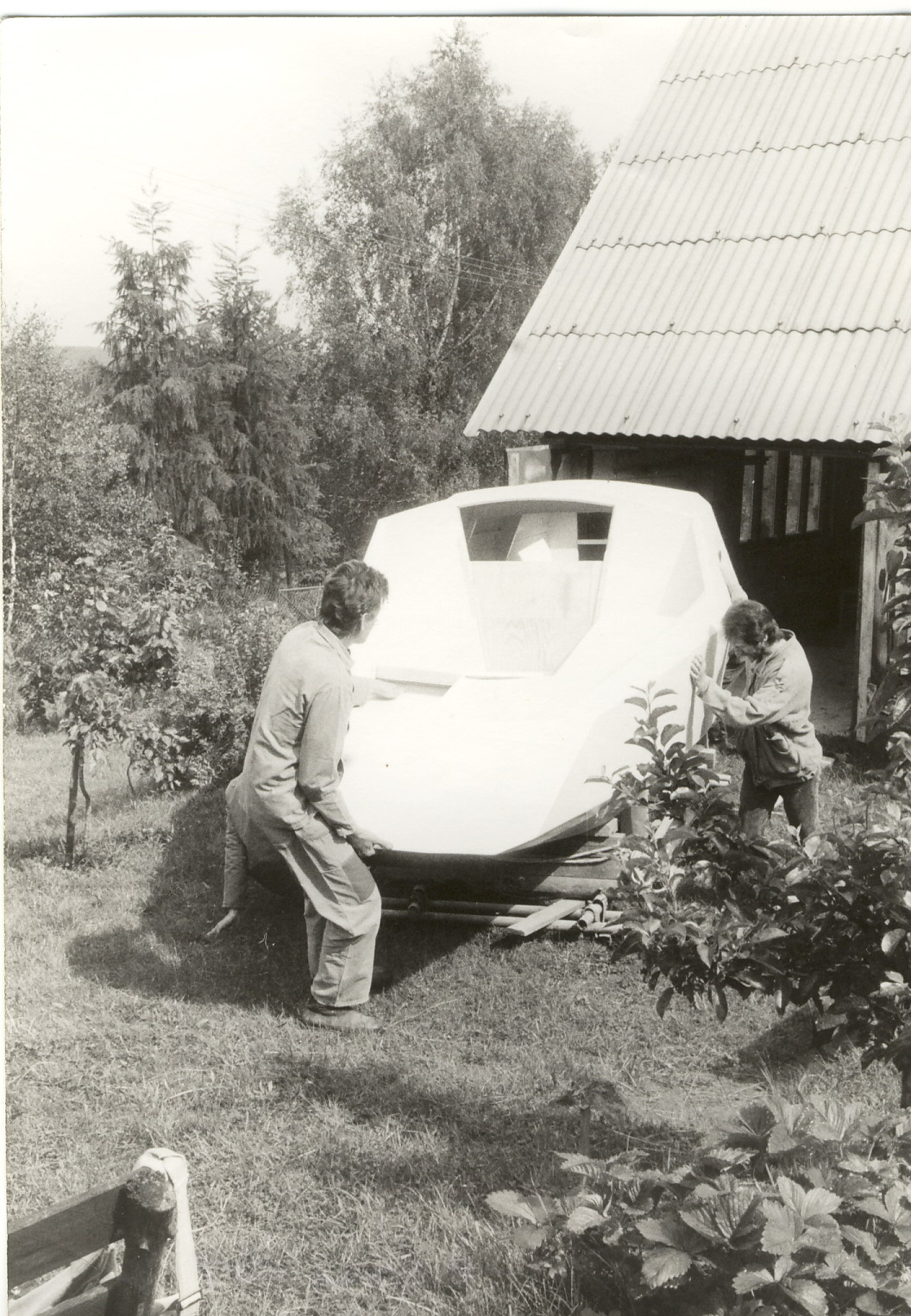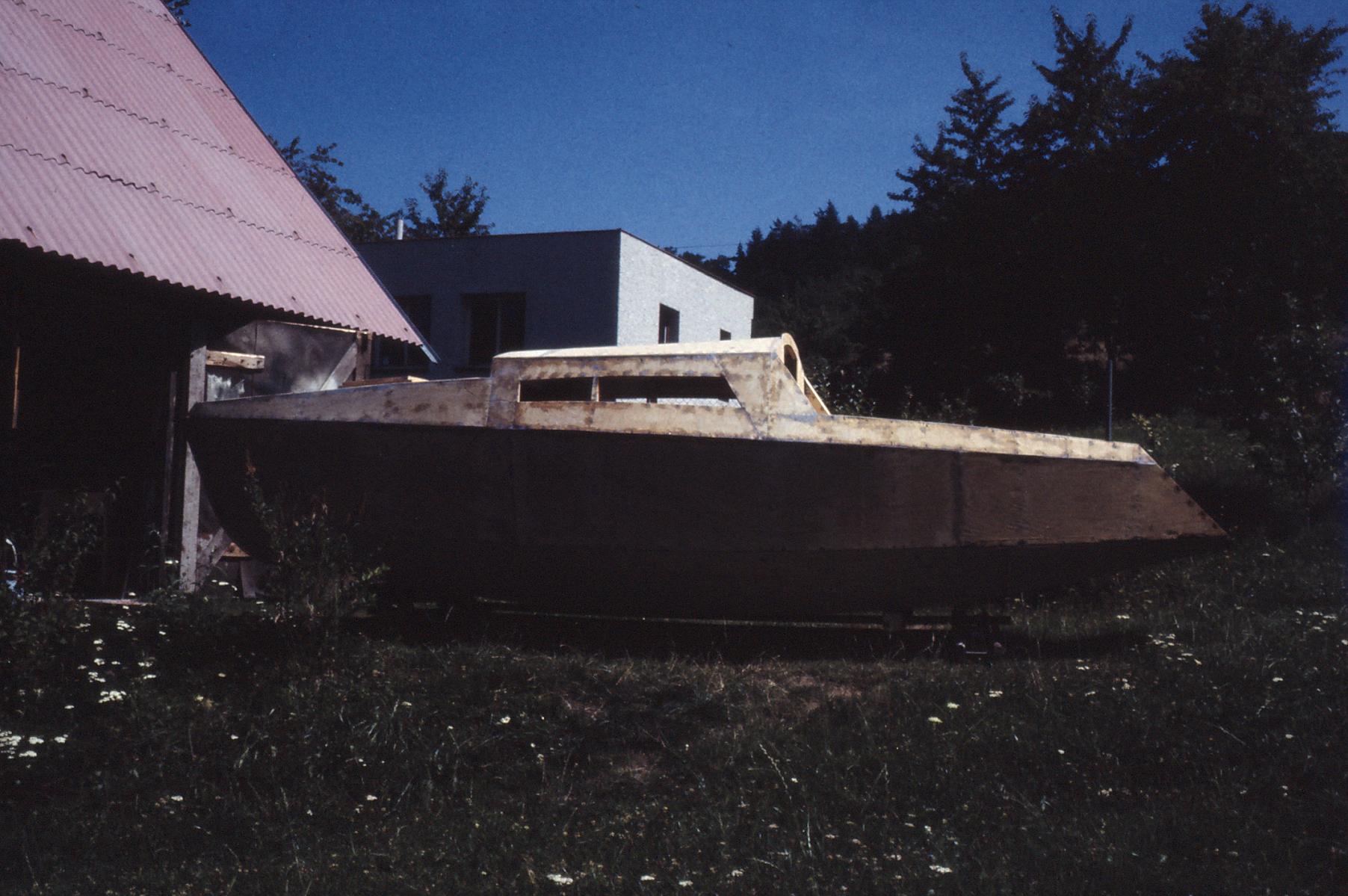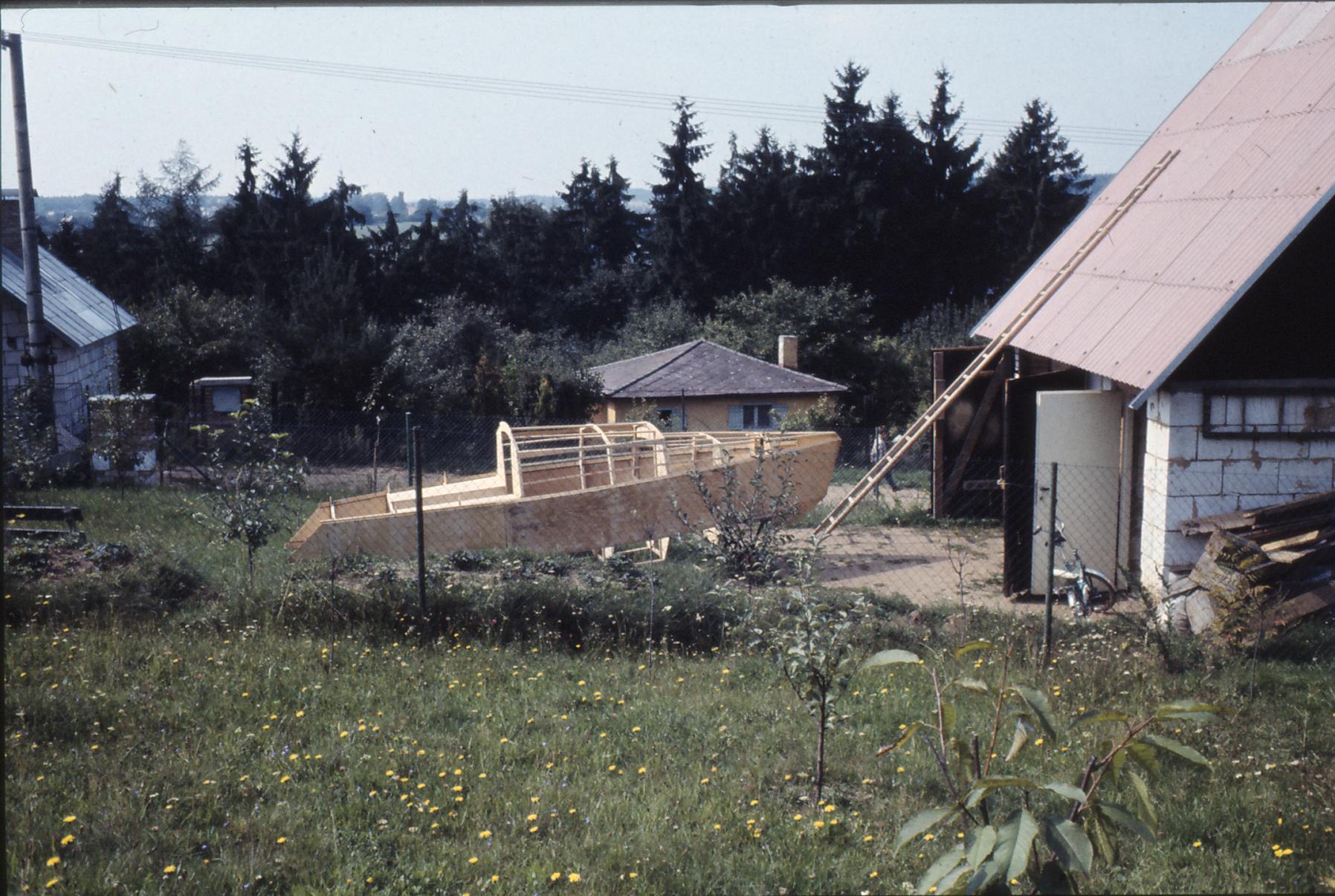 Svoji první loď, dvoukýlovou 5,5 metru dlouhou kajutovou plachetnici jsem začal stavět ve sklepě paneláku. Bylo tam teplo i v zimě, prostor byl velký, jen jsem byl limitován dveřmi 120 cm. Vyrobil jsem tak přes zimu všechny přepážky, kýly, kormidlo, díly interieru, kování..vše co se dalo vynést po schodech ven. Brzy na jaře jsme s bráchou na jeho pozemku za 3 měsíce postavili hrubou stavbu chaty 6x6 metrů z tvárnic, přízemí zatím bez přepážek, nahoře si brácha dodělal podkroví. Místo jedné stěny byly provizorní vrata, když bylo teplo vyvážel jsem rozestavěnou loď na podvozku ven.