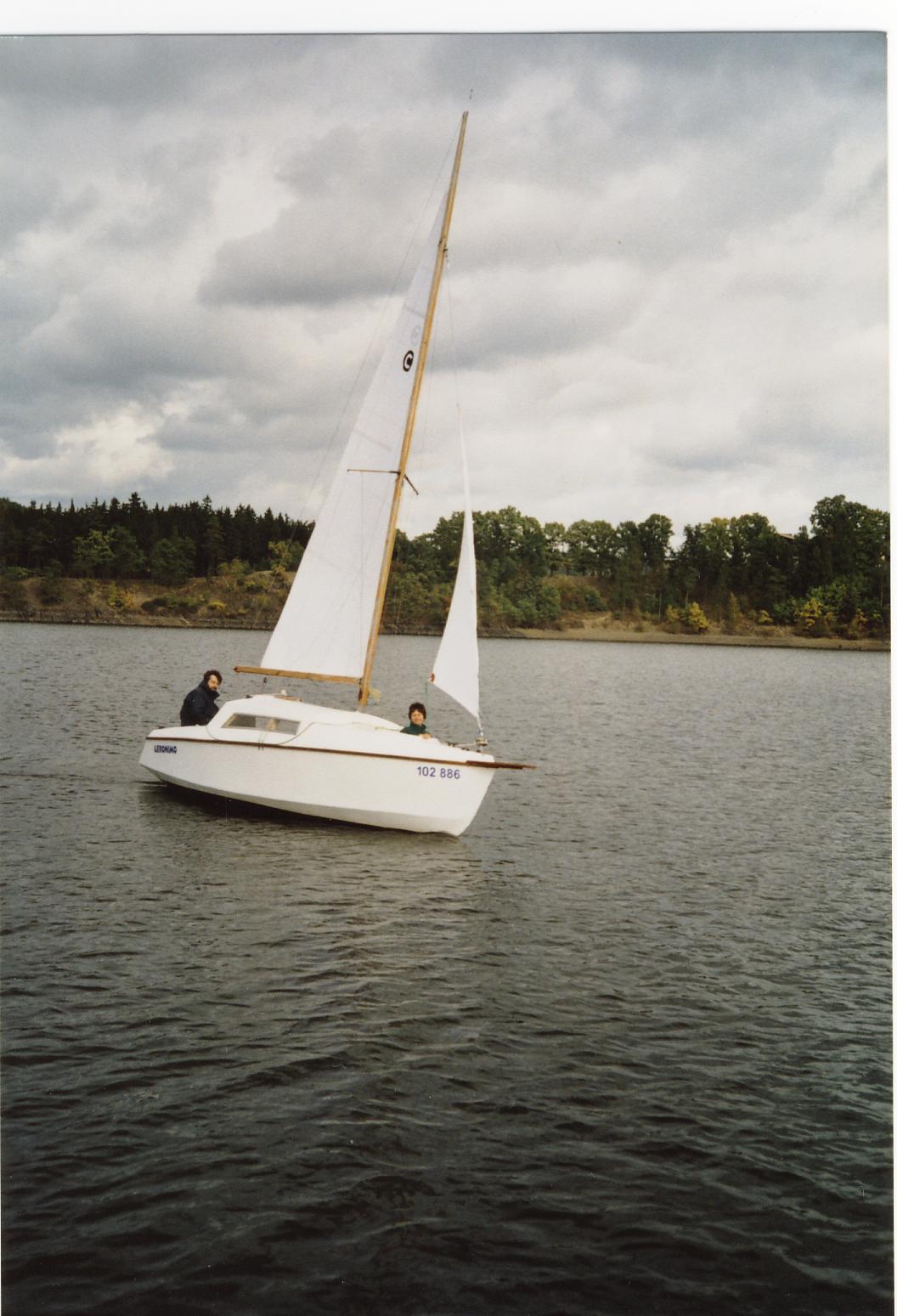 Není to Korzár, ale Rebel konstruktéra Milana Krňáka prodloužená asi o 50 cm negativním sklonem zrcadla. Váha asi 600 kg včetně vyjímatelného olověného balastu.Plachty byly ze 470 a druhou sadu jsem měl z Korzára.
