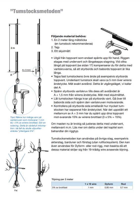 (konečná kontrola naspětí je dosažena pouze během plachtění). Pro tento účel jsou na trhu více či méně spolehlivé měřicí přístroje. Seldén vyvinul metodu která vám poskytne potřebné informace o vybavení, které pravděpodobně už máte. Měli byste vědět následující:
