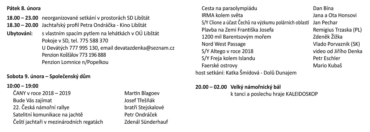 Již téměř padesát let se schází druhou únorovou sobotu vyznavači námořního jachtingu v Libštátě. Nejinak tomu bude i v tomto roce. 9. února v 10 hodin se opět spustí devítihodinová přehlídka toho nejzajímavějšího z našeho sportu. Opět jedinečný program a příležitost osobního setkání s osobnostmi námořního jachtingu.
