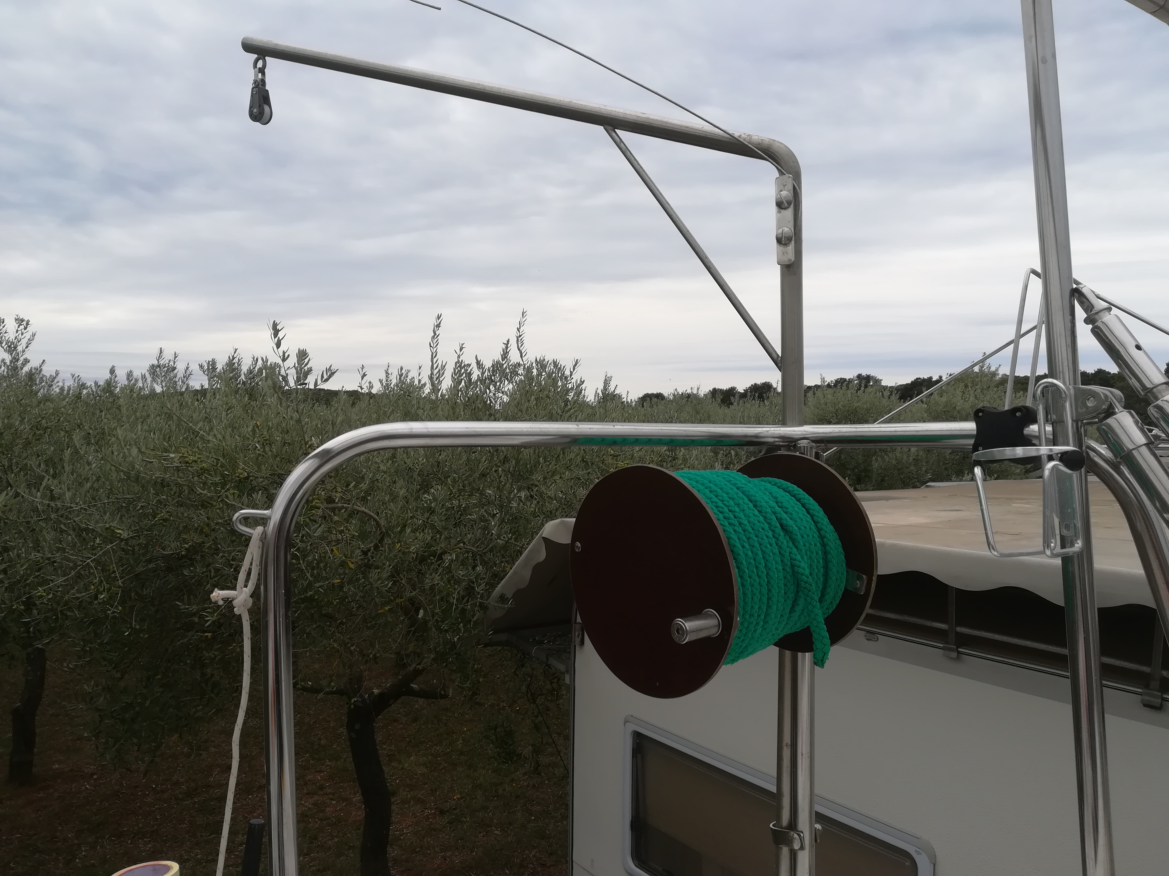 1x přední kladkostroj mrtvého muže (základna s rolnami pro instalaci na špičce a kladkostroj s rolnami, ke kterému pak už je zapotřebí jenom áčko z trubek podle potřebné velikosti lodě) - nové