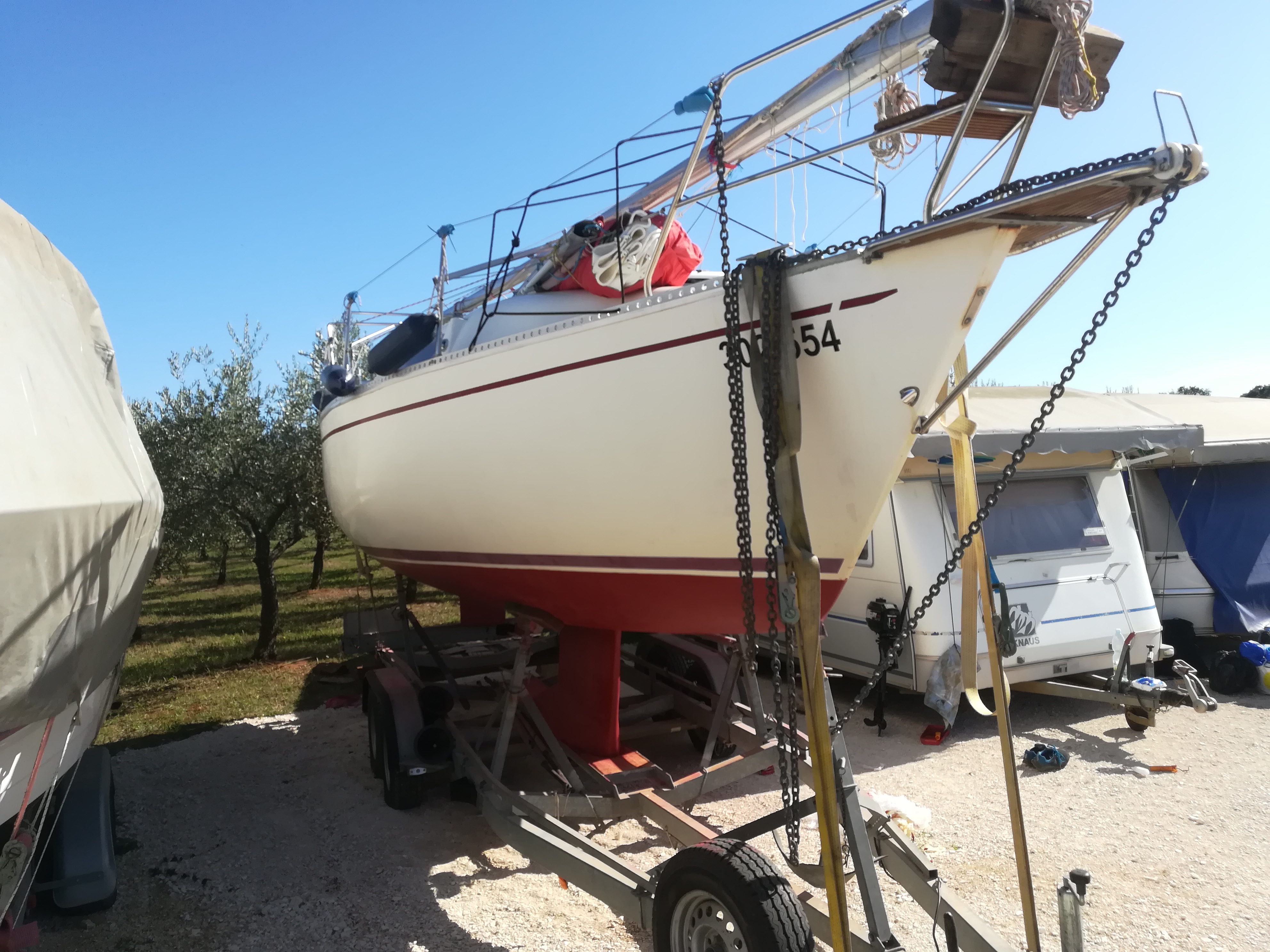 Plachetnice délky 7,65m,šířky 2,78m,ponor 1,15m,Nové oplachtění(kosatka 2016,hlavní 2018)nové biminy,kočárek,lazy back,nosič na pomocný člun na zádi z nerezi,fekální nádr s macerátorem,nová servisní baterie 80Ah(2019),rolky na vyvazovací lana na zádi -každé 50m lana.Měnič napětí 12/230V 350W,nabíjecí satnice při připojení v maríně s rozvodem 230V,lednice 12/230V a plyn,síťky proti hmyzu.Navigace Navman s mapami HR ,autopilot atd .Velmi pěkná udržovaná.Možnost stání v HR za 300 Eu/rok 2 km od jeřábu a maríny.Vozík a pomocný nafukovací člun s motorem Mercury 3,3 k lodi.V ceně i nová STK.Více foto a info na antesroman@email.cz nebo tel:603813520