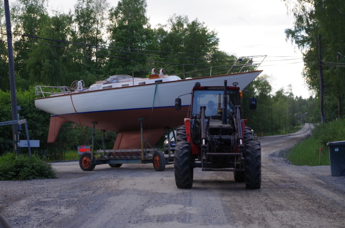 Loď přikurtuju dvěma 4 t kurtami k bokům vleku a jednou kurtou k držáku navijáku jako při transportu. Loďku pak zabalím jak nemluvně a plachtu dole stáhnu přes oka lanem. Vlek pak vyheveruji aby šel položit ve 4 bodech na betonové sokly, demontuju kola a celý vlek přivážu čtyřmi 4t kurtami k okám, které jsou na chemii v betonu cca 3 m od lodě. Dále spojím spodem protilehlá oka plachty slabšími kurtami a přiměřeně vypnu.
