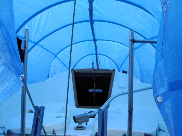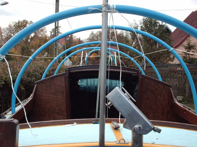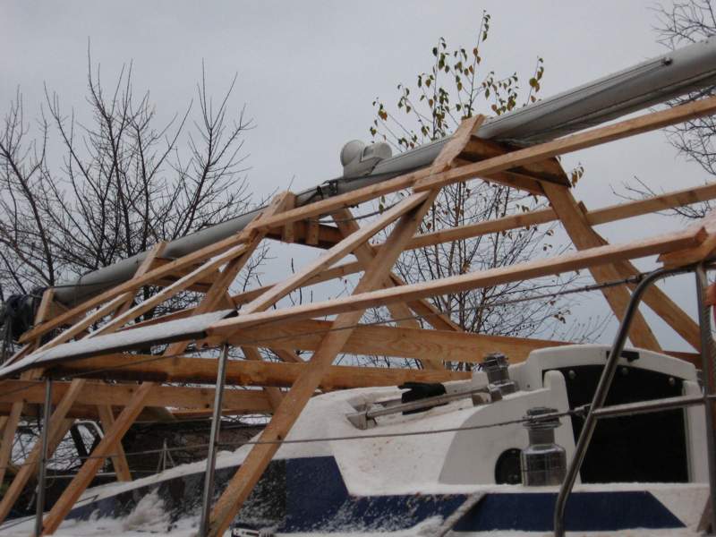 Pokud budeš celou loď zakrývat plachtou, je lepší vyrobit jednoduchou konstrukci ještě nad stěžeň, třeba z bambusových tyčí (dají se koupit v zahrádkářských potřebách) dají se svazovat a ohýbat. Je to lepší, než hodit plachtu přímo přes stěžeň, který má různé kování a plachta se do jara roztrhá. Nech na přídi a zádi volný prostor, aby se pod plachtou větralo a nekondenzovala vlhkost. Lepší je postavit lehkou rozebíratelnou konstrukci a dát na ní lehkou laminátovou krytinu a na jaře to zase celé zase demontovat. Plachta má tu nevýhodu, že jí voda nebo těžký sníh prohne, udělá "lavory" a časem se protrhne. Navíc pokud to máš u baráku pod oknem ložnice, tak celou zimu plachta ve větru šustí, třepe se a je to docela kravál.